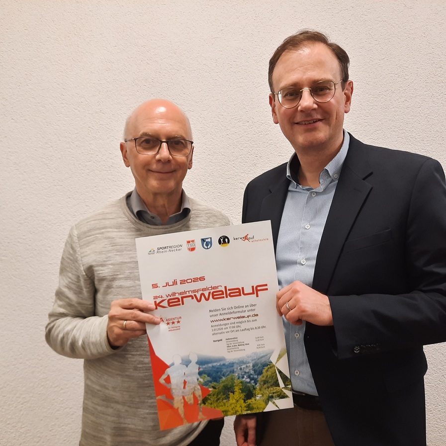v.l.: Klaus Höhr und Bürgermeister Dr. Tobias Dangel mit dem neuen Kerwelauf-Flyer